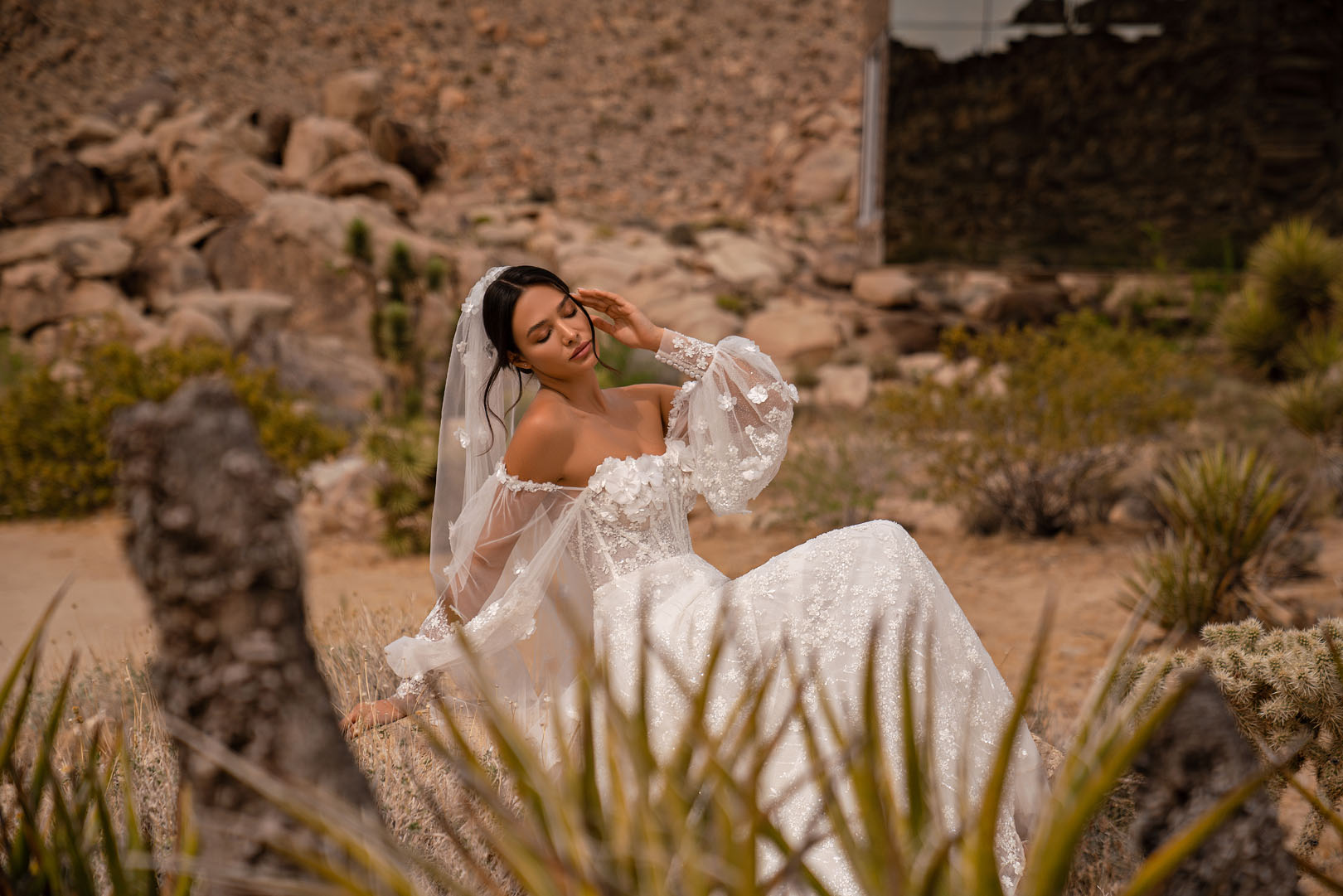 This luxurious wedding dress is made of guipure with 3D flowers, and is a true masterpiece of art that impresses with its beauty and sophistication.